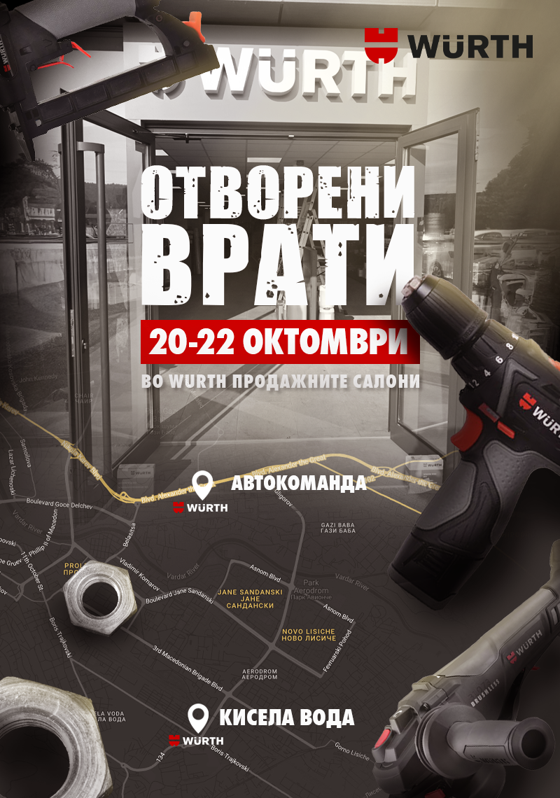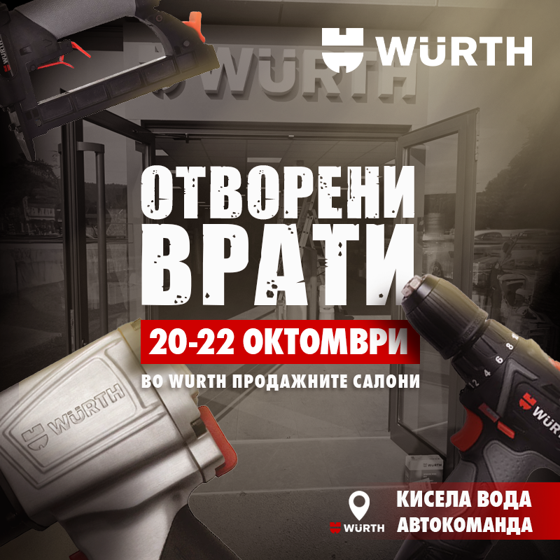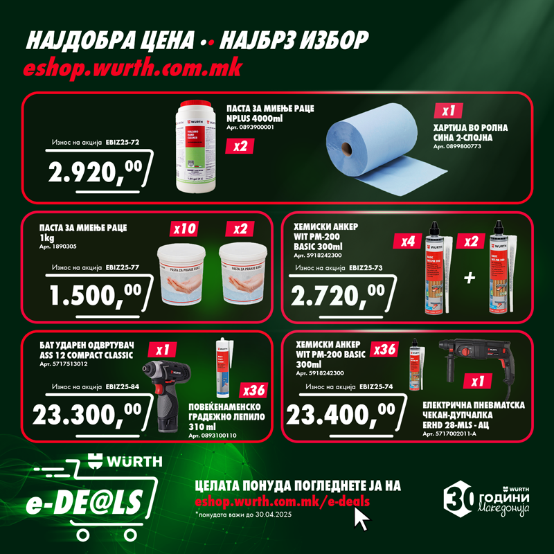 Искористете ја можноста да добиете дел од нашите производи по специјални цени. Понудите се однесуваат за ограничени количини, во ограничен временски период. Побрзајте и станете еден од многуте задоволните WURTH купувачи.